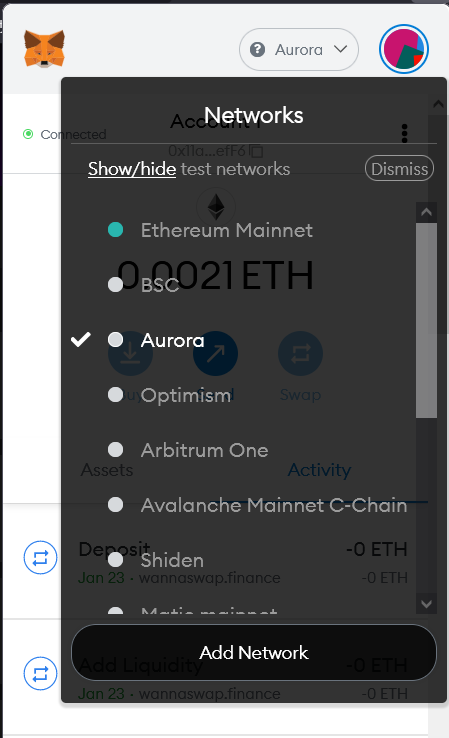 ArthSwapとメタマスクの接続に成功すると、ページの右上にメタマスクウォレットのアドレスが表示されるようになります。これでArthSwapで暗号を扱うための準備は完了です。